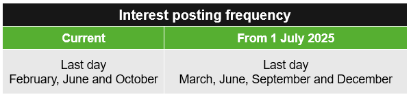 Effective 1 July 2025, interest on these accounts will now be paid four times a year (quarterly) and posted at the end of each quarter. This means account holders can access their hard earnings more often throughout the year.