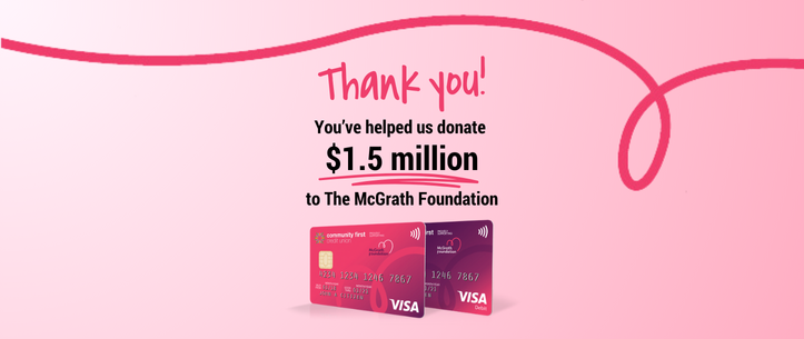 If you’d like to contribute to the McGrath Foundation and support individuals and families affected by breast cancer, consider applying for one of Community First’s pink products. Credit eligibility criteria, terms and conditions, and fees and charges apply.