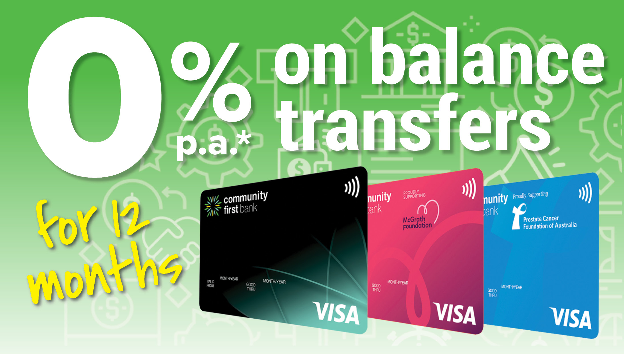 Switch your credit card balance to a Community First Visa card and receive 0% p.a.* interest on balance transfers for the first 12 months. Credit eligibility criteria, terms & conditions, fees & charges apply. Excludes the n0w card.