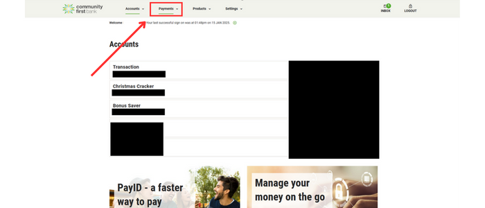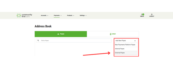 Select ‘Add New Payee‘ and find the option of which kind of payee you would like to add. If they are a Community First Member select ‘Internal Payee‘. If they are with another bank select ‘External Payee‘.
