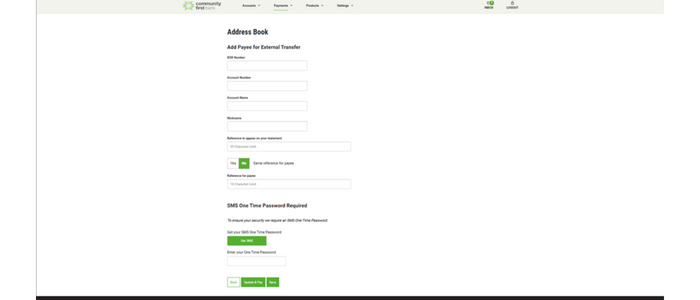 Add the details of the payee in the form. To protect your account, you will need to have a One Time Password sent to your mobile to verify your identity. Then select ‘Update and Pay‘ to continue paying the new payee or ‘Save‘ if you don’t need to transfer them money yet.
